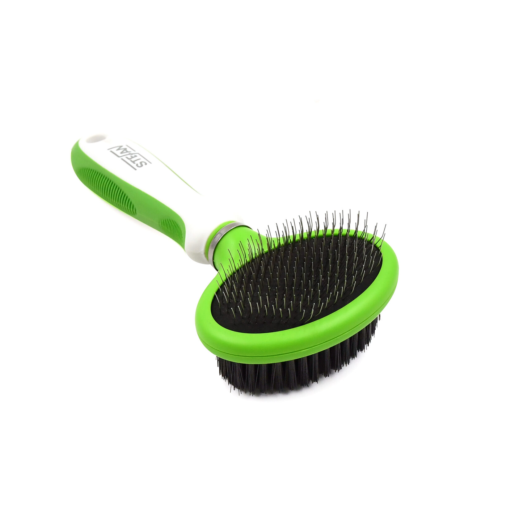 Пуходерка-щетка для животных 2 в 1 STEFAN подходит для всех типов шерсти. Инструмент оснащен уникальной плавающей ручкой, которая обеспечивает высокий комфорт для питомца и хозяина во время процедуры ухода. Щетина выполнена из высококачественного нейлона, мягкая и прочная. Зубья пуходерки изогнутые и выполнены из нержавеющей стали. Пуходерка-щетка безопасная и долговечная. Эргономичная противоскользящая ручка уменьшает напряжение и предотвращает выскальзывание инструмента.
