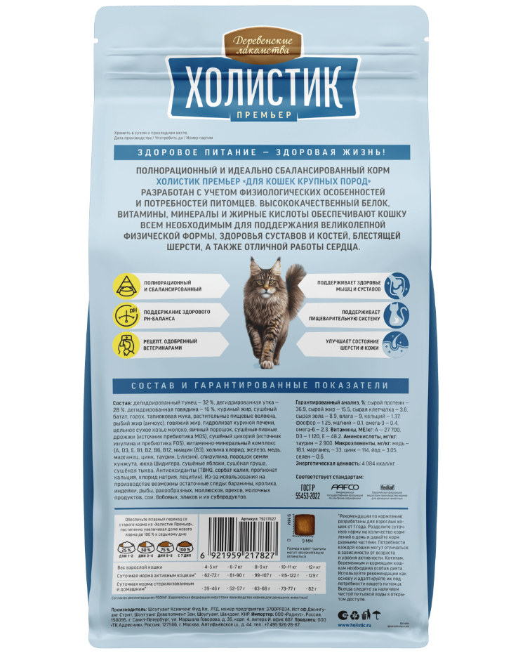 Серия полнорационных кормов «Холистик Премьер. Для кошек крупных пород» разработана с учетом физиологических особенностей и потребностей питомцев. Высококачественный белок, витамины, минералы и жирные кислоты обеспечивают кошку всем необходимым для поддержания великолепной физической формы, здоровья суставов и костей, блестящей шерсти, а также отличной работы сердца.