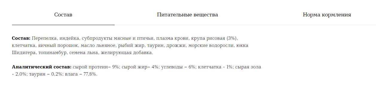 Состав: Перепелка, индейка, субпродукты мясные и птичьи, плазма крови, крупа рисовая (3%), клетчатка, яичный порошок, масло льняное, рыбий жир, таурин, дрожжи, морские водоросли, юкка шидигера, корень цикория, семена льна, карамель, желирующая добавка.
