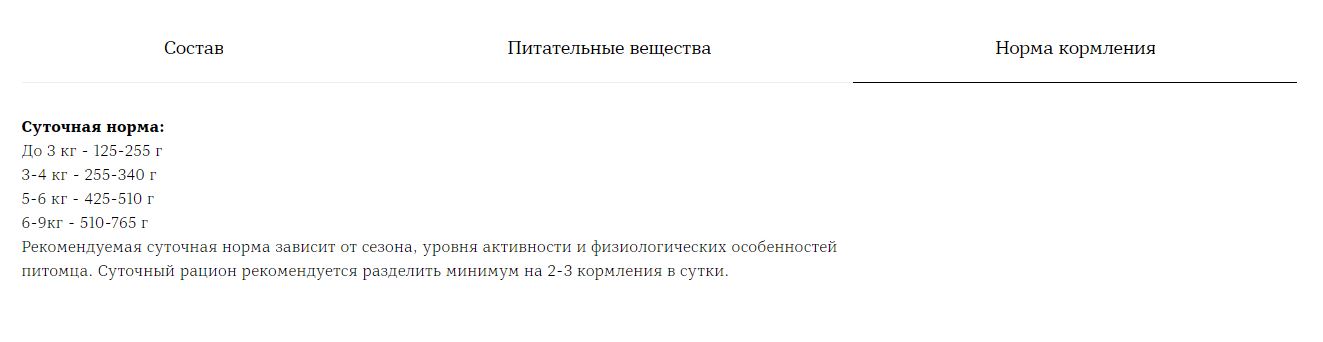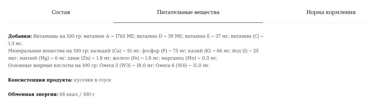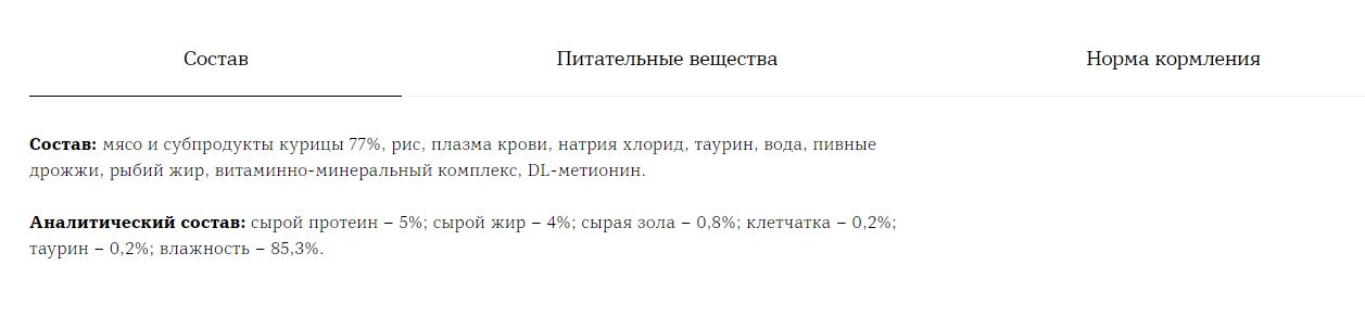 Аналитический состав: сырой протеин – 5%; сырой жир – 4%; сырая зола – 0,8%; клетчатка – 0,2%; таурин – 0,2%; влажность – 85,3%.