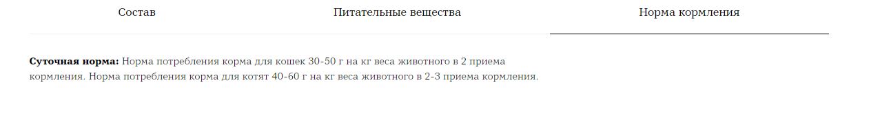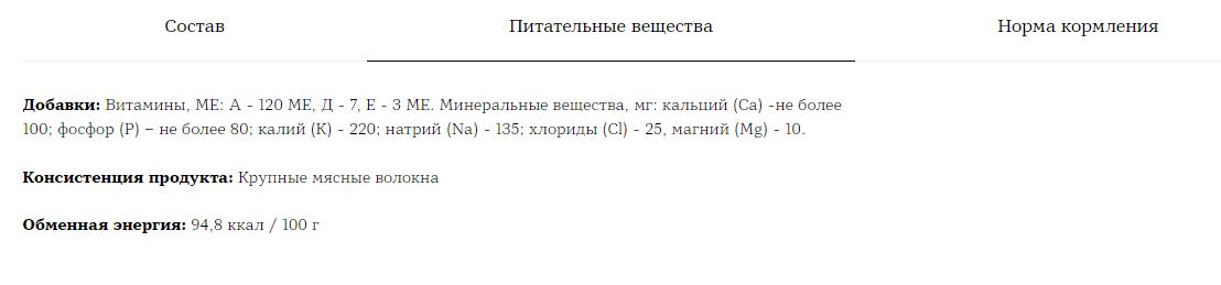 Аналитический состав: сырой протеин– 10,5%; сырой жир– 5,5%; клетчатка - 0,5%; сырая зола - 2,0%; таурин – 0,2%; влага –82,0%