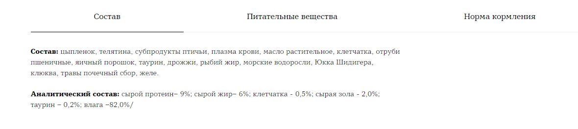 Состав: цыпленок, телятина, субпродукты птичьи, плазма крови, масло растительное, клетчатка, отруби пшеничные, яичный порошок, таурин, дрожжи, рыбий жир, морские водоросли, Юкка Шидигера, клюква, травы почечный сбор, желе.