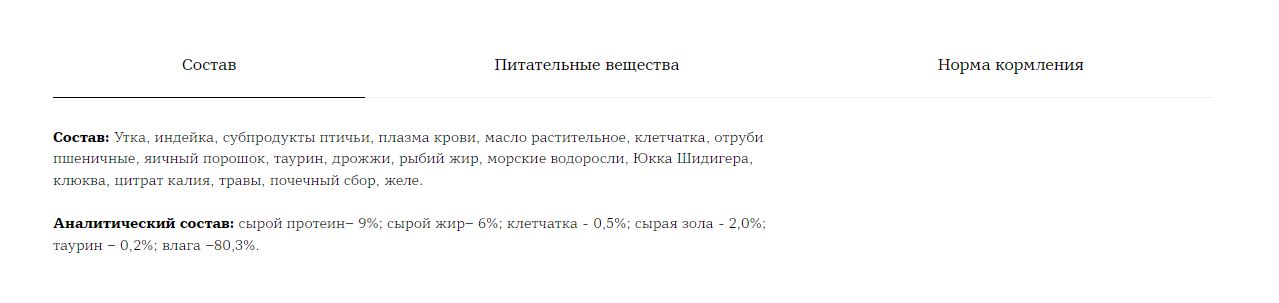 Состав: Утка, индейка, субпродукты птичьи, плазма крови, масло растительное, клетчатка, отруби пшеничные, яичный порошок, таурин, дрожжи, рыбий жир, морские водоросли, Юкка Шидигера, клюква, цитрат калия, травы, почечный сбор, желе.