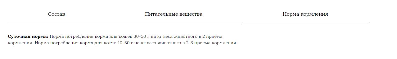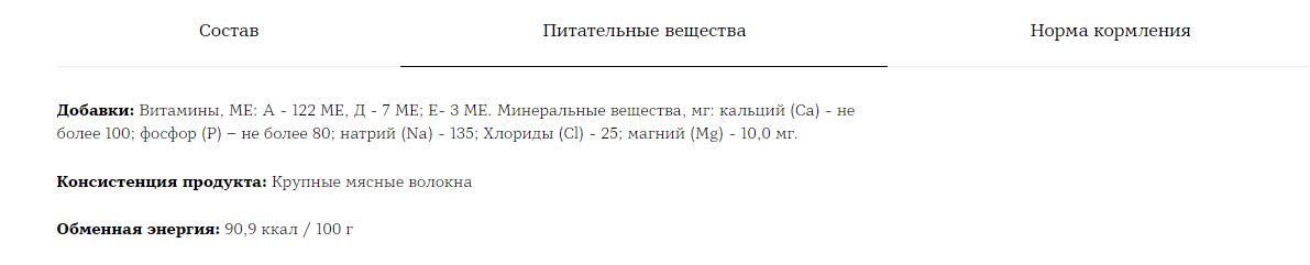 Аналитический состав: сырой протеин– 9,5%; сырой жир– 6,5%; клетчатка - 0,5%; сырая зола - 2,0%; таурин – 0,2%; влага –82,0%.