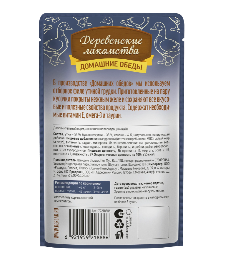 Деревенские лакомства пауч для кошек Утка с кроликом в желе 70 г для кошек