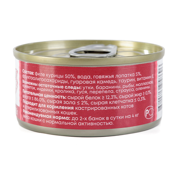 Состав: филе курицы 50%, вода, говяжья лопатка 5%, фруктоолигосахариды, гуаровая камедь, таурин, витамин Е. Питательная ценость: сырой белок ≥ 12,3% ,сырой жир ≥ 0,1% , влажность ≤ 86,0%, сырая зола ≤ 2%, сырая клетчатка ≤ 0,3%.