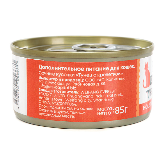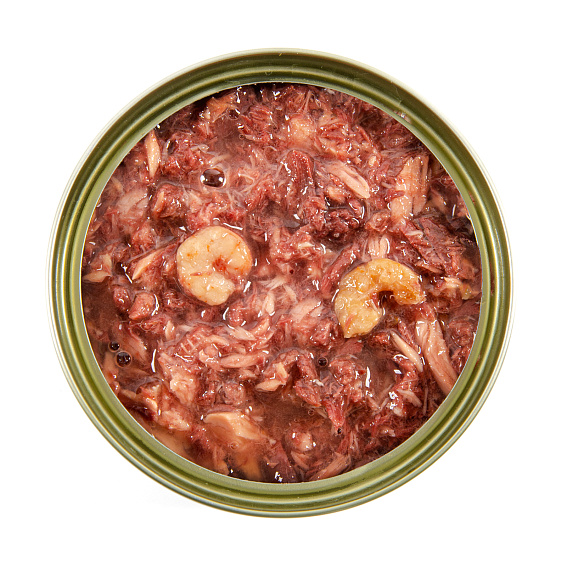 Состав: Тунец 55%, вода, креветки 3%, гуаровая камедь, таурин, кальций, сорбат калия, витамин А, витамин D3, витамин Е.
