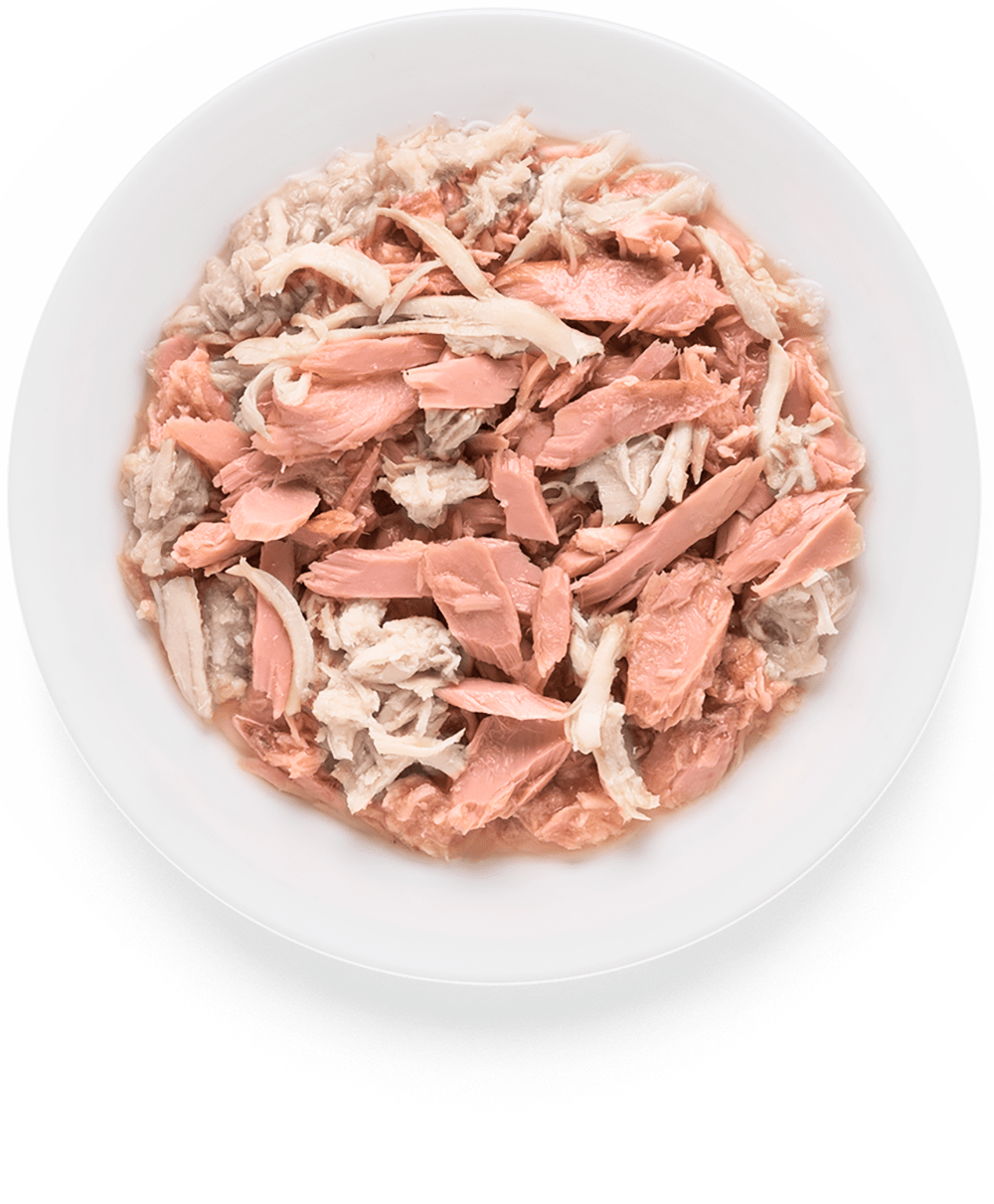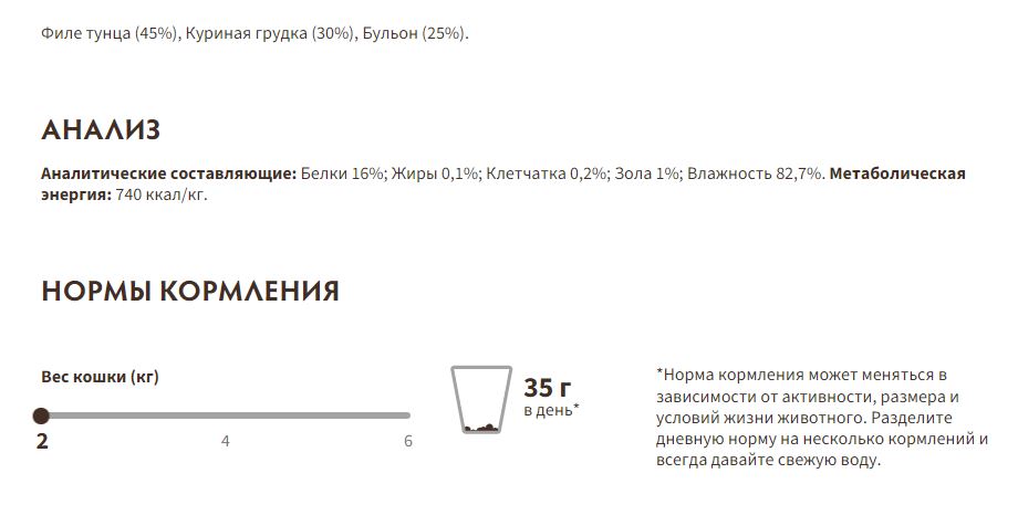 Состав: филе тунца - 45%, куриная грудка - 30%, бульон - 25%, зерновых - 0%.