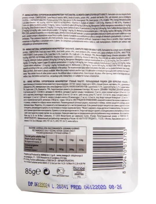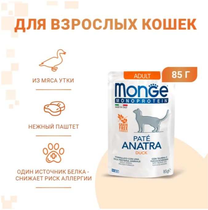Monge (Монж) Cat Speciality Line Monoprotein полнорационные беззерновые паучи из мяса утки для взрослых кошек и котов 85 г.