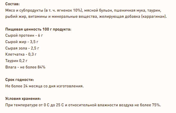Мясо и субпродукты (в т. ч. ягненок 10%), мясной бульон, пшеничная мука, таурин, рыбий жир, витамины и минеральные вещества, желирующая добавка (каррагинан).