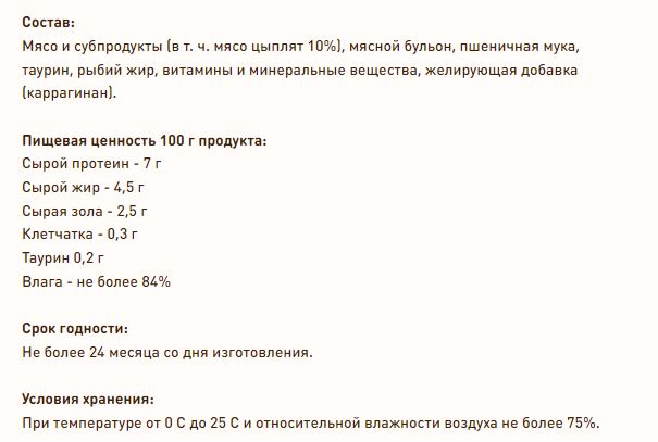 Мясо и субпродукты (в т. ч. мясо цыплят 10%), мясной бульон, пшеничная мука, таурин, рыбий жир, витамины и минеральные вещества, желирующая добавка (каррагинан).