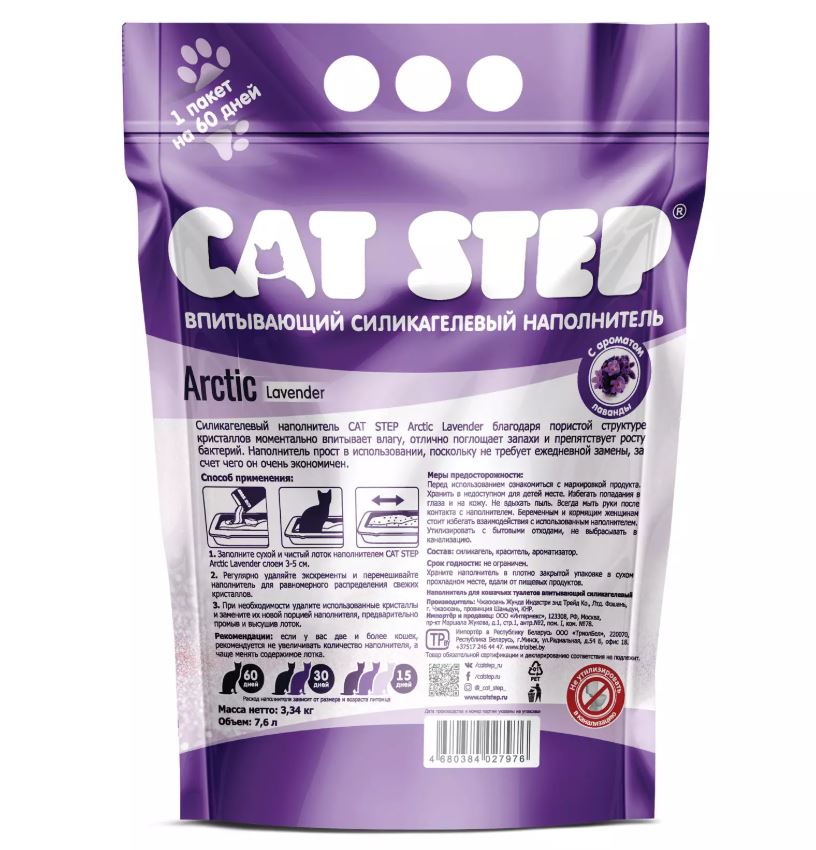 Cиликагелевый наполнитель для кошачьего туалета CAT STEP Arctic Lavеnder моментально впитывает влагу и уничтожает запахи.