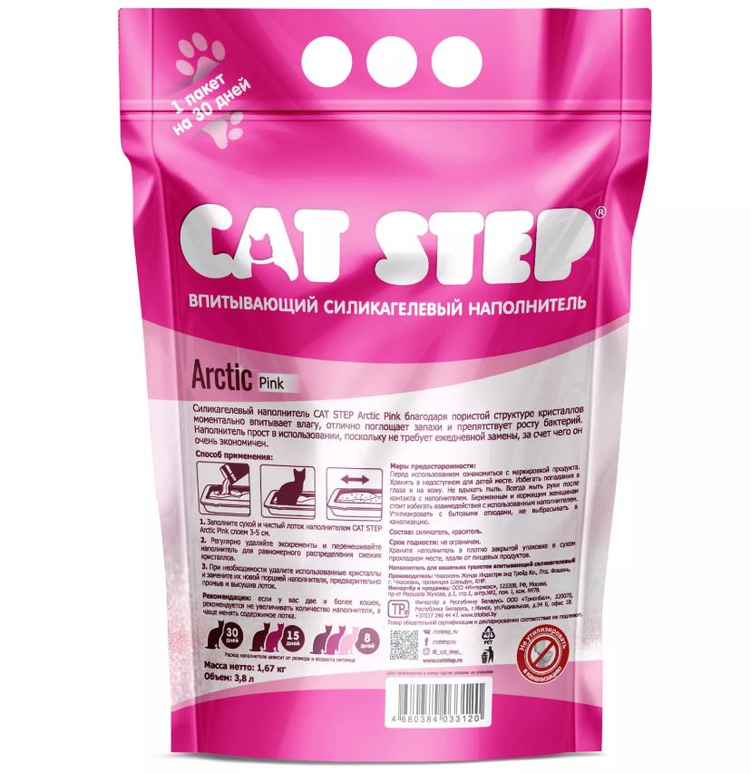 Cиликагелевый наполнитель для кошачьего туалета CAT STEP Arctic Pink с розовыми гранулами моментально впитывает влагу и уничтожает запахи.
