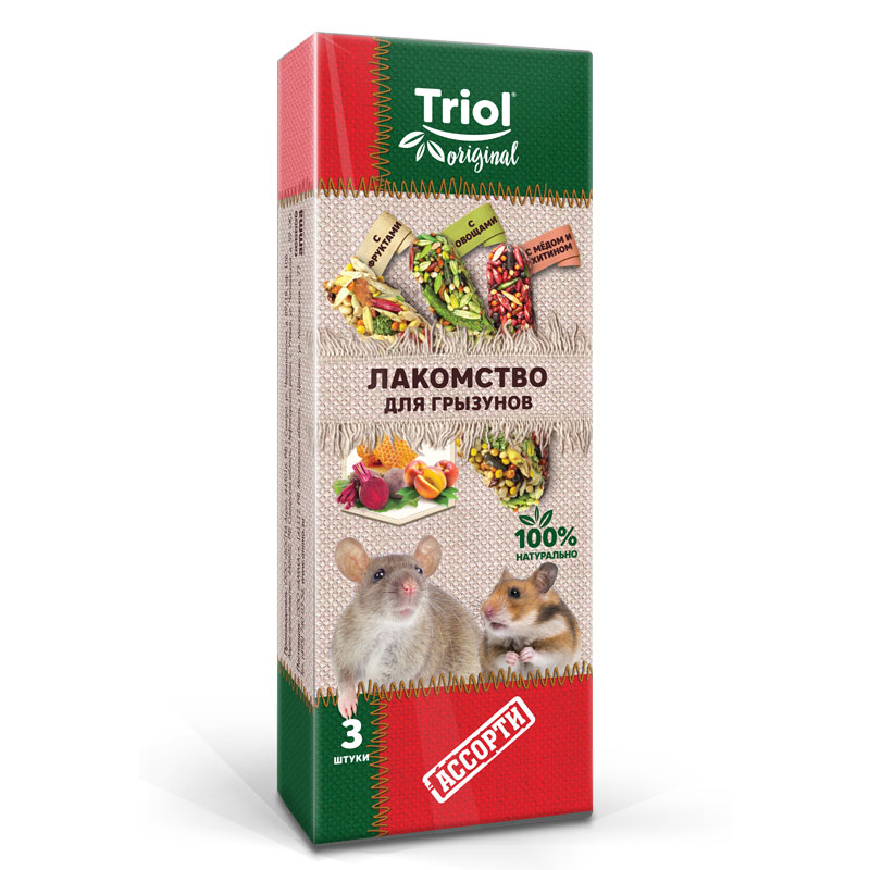 Лакомство для грызунов АССОРТИ (с фруктами, с овощами, с мёдом и хитином): три палочки разных лакомств запаяны в полиэтиленовый пакет и уложены в картонную коробочку.