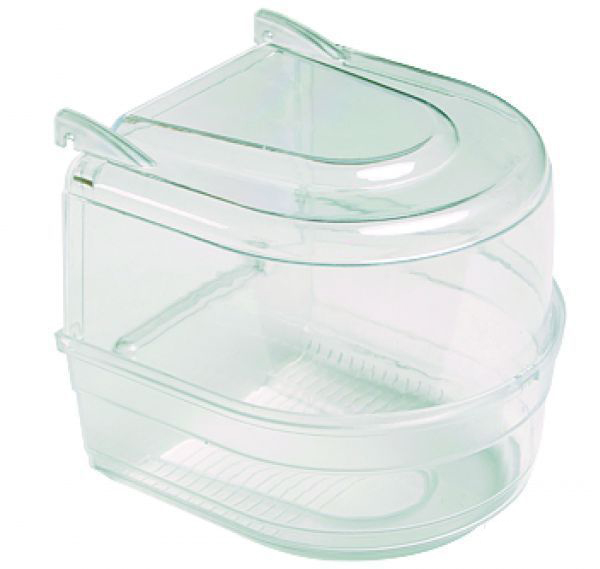 Для этого создана такая купалка из прозрачного нетоксичного пластика, которую легко закрепить на внешней стороне клетки - напротив дверцы.