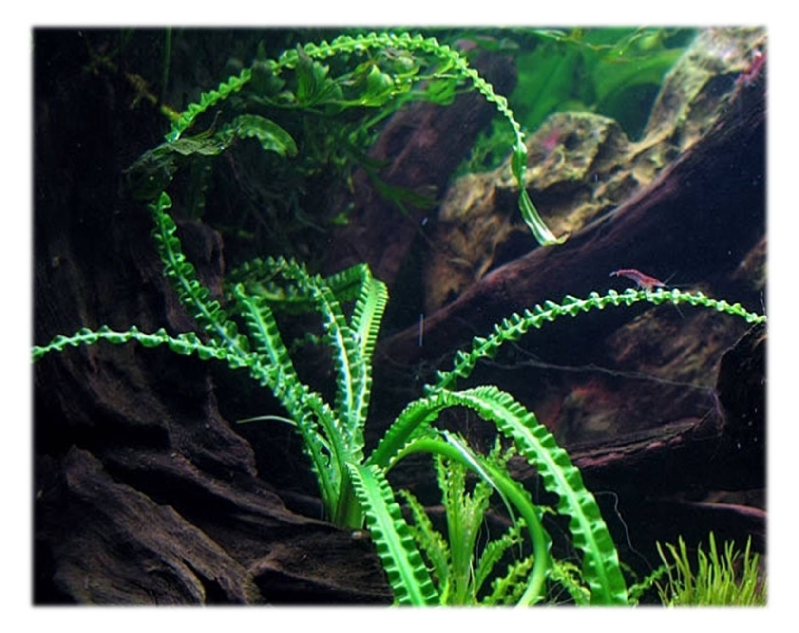 Несмотря на то, что волнистый кринум является самым маленьким из своего семейства, его рост может достигать немалых размеров. В высоту взрослое растение может достигать от 70 до 140 см, а в некоторых случаях его длина может доходить до 170 см. По внешности кринум представляет из себя розетку из длинных, закручивающихся в воде листьев, их число может доходить до 40. Из-за их жесткости даже травоядные рыбы обходят их стороной. В оптимальных условиях способен цвести белыми цветами с приятным запахом. Их внешний вид, конечно, уступает соцветиям плавающего кринума, но вот аромат точно остается вне конкуренции.