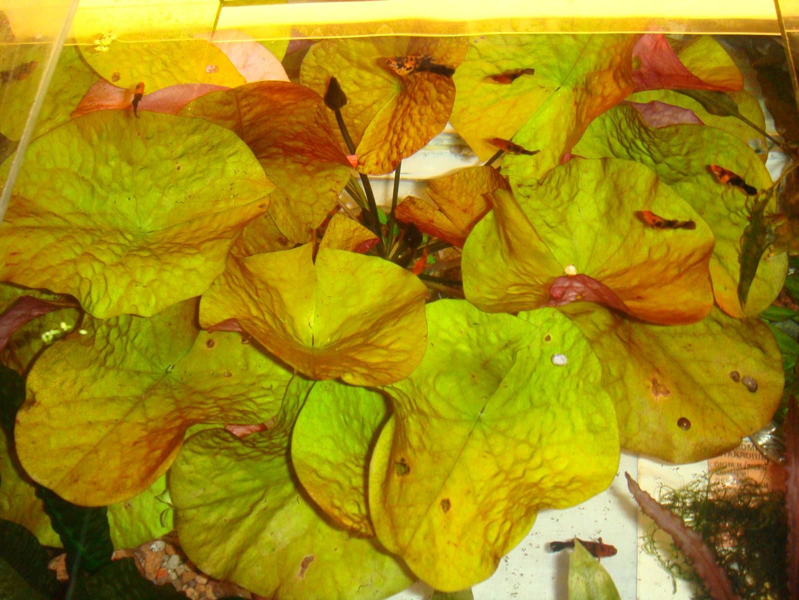 Свое обиходное название – “тигровые” — нимфеи получили за отчетливые хаотично расположенные бордовые разнокалиберные пятна, разбросанные по верхней и нижней стороне листовой пластины (у краснолистной формы они несколько темнее). Нижняя поверхность листьев имеет светло-фиолетовую окраску, отчетливо проявляющуюся у извлеченных из воды кустов при естественной освещении. Искусственный свет делает фиолетовый оттенок невидимым, и реверсивная сторона листа становится похожей на лицевую, только немного бледнее. Молодые растения покупают полностью сформированными с сочно окрашенными листьями на невысоких черешках, мелкие кустики медленно приживаются и зачастую сбрасывают листья. Активно растут круглый год.