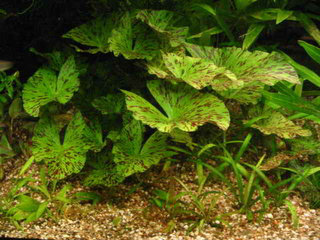 Свое обиходное название – “тигровые” — нимфеи получили за отчетливые хаотично расположенные бордовые разнокалиберные пятна, разбросанные по верхней и нижней стороне листовой пластины (у краснолистной формы они несколько темнее). Нижняя поверхность листьев имеет светло-фиолетовую окраску, отчетливо проявляющуюся у извлеченных из воды кустов при естественной освещении. Искусственный свет делает фиолетовый оттенок невидимым, и реверсивная сторона листа становится похожей на лицевую, только немного бледнее. Молодые растения покупают полностью сформированными с сочно окрашенными листьями на невысоких черешках, мелкие кустики медленно приживаются и зачастую сбрасывают листья. Активно растут круглый год.