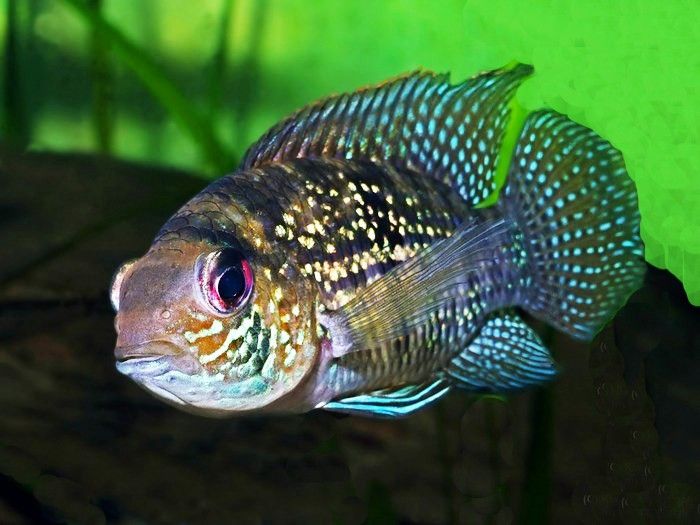 Акара перуанская очень ценится среди аквариумистов благодаря своей окраске. Все ее тело имеет медно – зеленый цвет, а от глаза до хвоста с каждой стороны идет продольная черная полоса. Все тело и плавники рыбки покрыто блестящими пятнами серебристого и зеленого цвета. Во время нереста окраска акары перуанской становится более интенсивной, яркой.