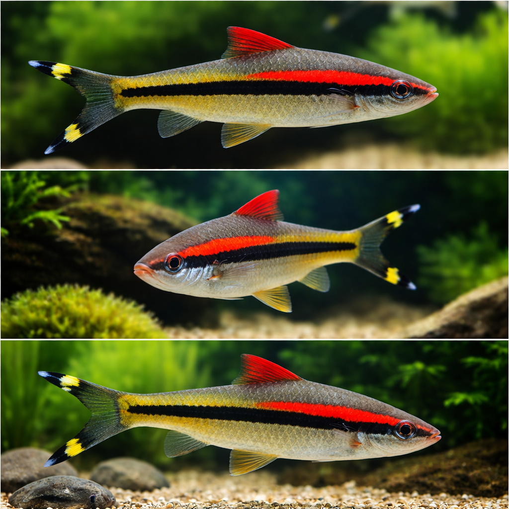 У этой породы ярко-красные плавники, а на хвосте красиво чередуются желтые и черные полоски. В период полового созревания на голове появляется ярко-зеленая полоса. У взрослых особей есть зеленые усики на губах, при помощи которых они ищут себе питание.