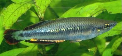 Самец на желтом теле имеет 2 параллельные темные полосы, одна из них проходит через глаз до начала хвостового плавника, а другая по нижней чaсти тела, которая тянется от гортани до анaльного плавника. Спинные и анальные плавники окрашены в красные цвета. У самки плавники прозрачные, хвостовой плавник, немного желтый у основания. В искусственных условиях эти рыбки живут около 8 лет.