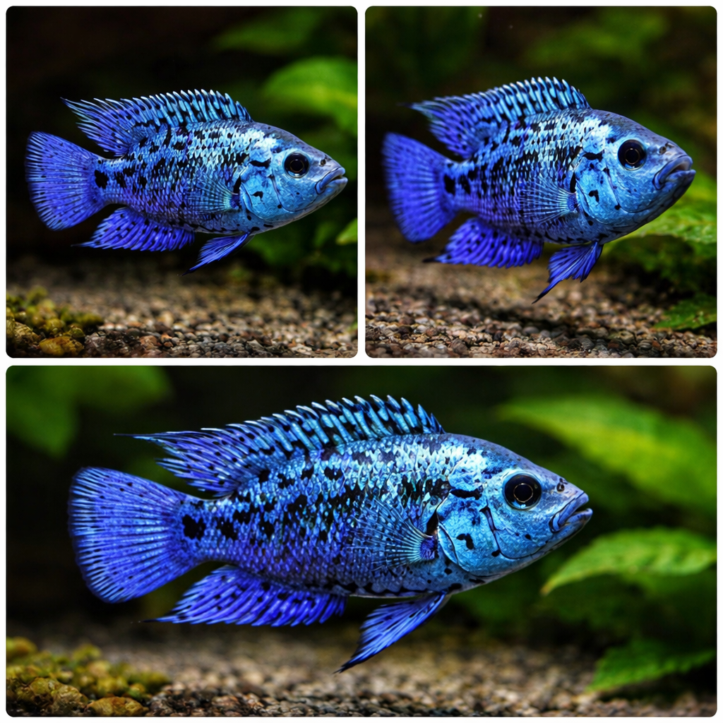 Блю Демпси (лат. Rocio octofasciata cf. англ. Electric Blue Jack Dempsey cichlid) считается одно из самых красивых аквариумных цихлазом.