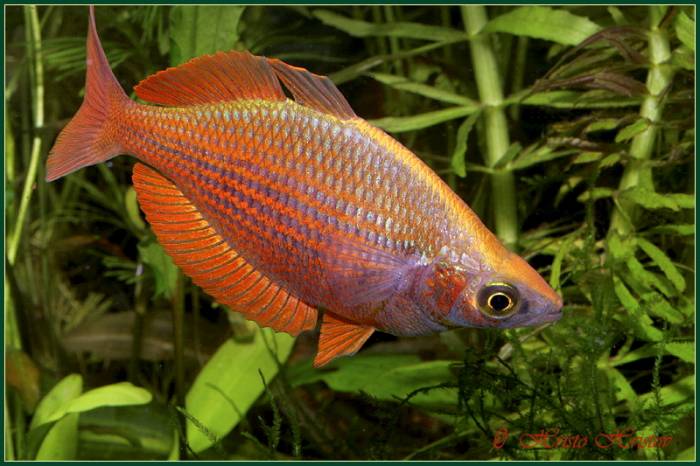 Глоссолеписы красные в молодости серебристого цвета. У самцов может меняться окраска тела с серебристого на черный цвет, если вы будете экспериментировать с освещением аквариума, включать и выключать его. Это связано с защитной реакцией относительно дня и ночи, чтобы более себя зашифровать от хищников.