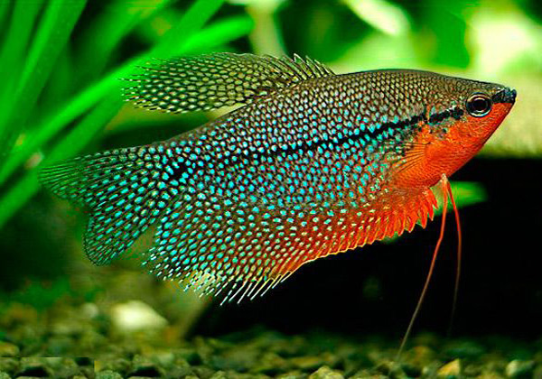 Гурами – пресноводные лабиринтовые рыбки, «фирменным знаком» которых являются брюшные плавники в виде длинных нитей. Эти самые нити являются у них органом осязания. Родина гурами — Юго-Восточная Азия и Индокитай. Часто можно видеть, как гурами ощупывают с помощью них стенки и декорации аквариума. Как и все представители лабиринтовых, гурами дышат атмосферным воздухом, поэтому аквариум не должен закрываться наглухо – под крышку всегда должен поступать свежий воздух. Гурами — одни из самых неприхотливых аквариумных рыбок, причем разводить их также легко, как и содержать. Размер тела всех видов гурами от 5 до 10 см, только змеевидный гурами может вырасти до 20см. Половые отличия этой рыбки выражены достаточно четко: самцы крупнее самок, ярче окрашены, их плавники длиннее (спинной плавник большой и вытянутый).
