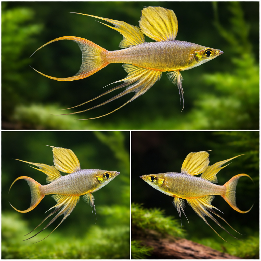 Внешний вид: Рыбка имеет стройное, сжатое с боков тело. Главная особенность самцов — роскошные веерообразные плавники с длинными нитевидными лучами [1].