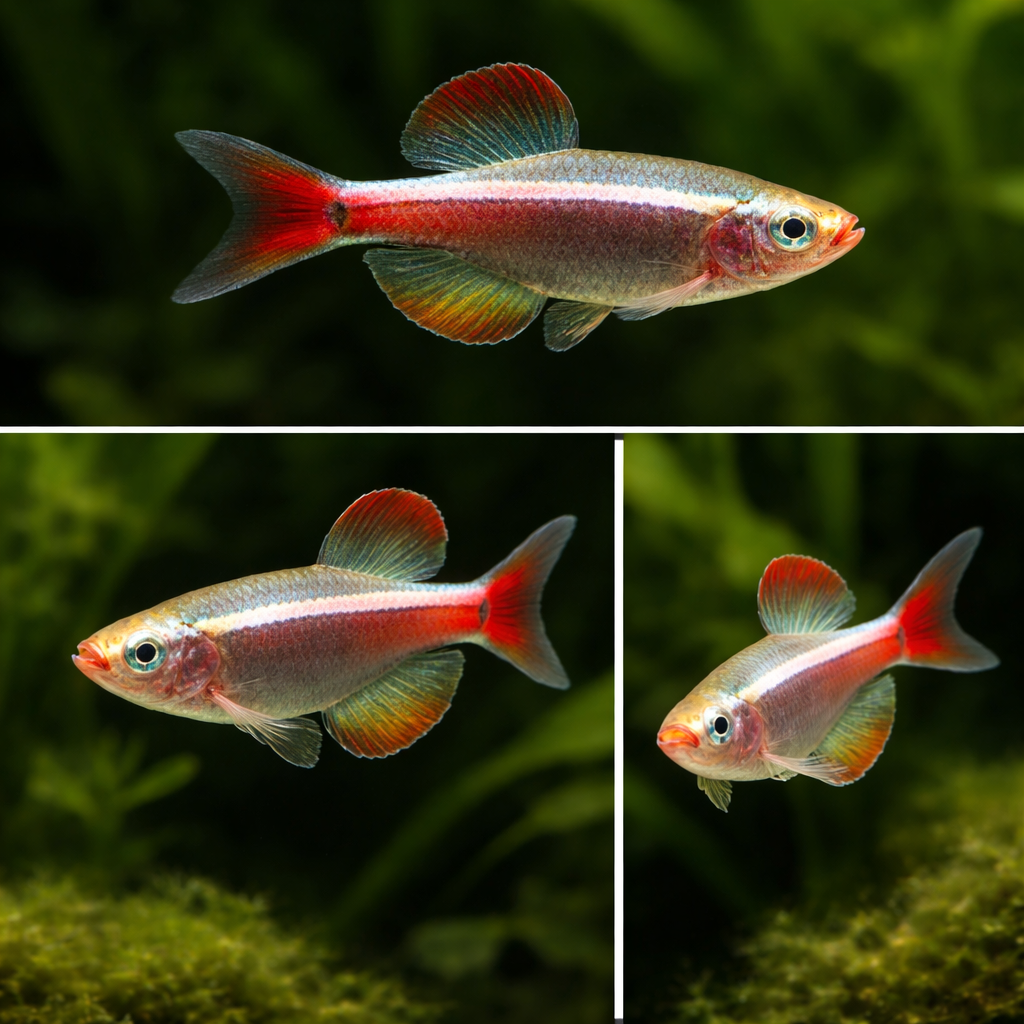Середина хвостового плавника ярко-красная с черным пятном в основании. Задняя часть туловища красноватая. Спинной плавник также красный, анальный – лимонно-желтый с переходом к красному.