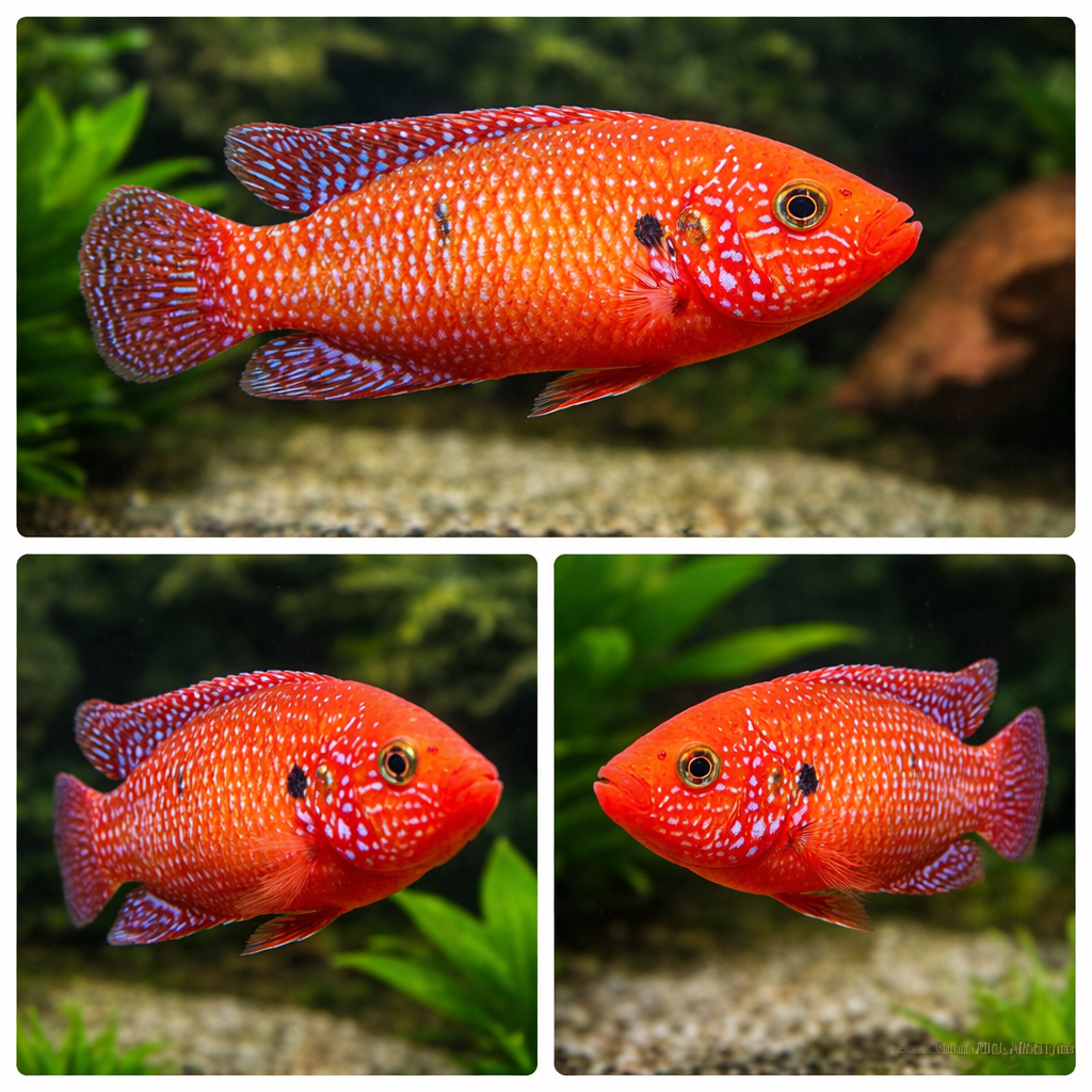 Уже из названия ясно что это очень красивая рыба. Цвет тела красный, вплоть до ярко-пурпурного во время возбуждения или нереста, с разбросанными по телу зеленоватыми точками. Посередине тела черное пятно. Достигает хромис-красавец 13-15 см в длину, что для цихлиды не очень много и продолжительность жизни порядка 5 лет.