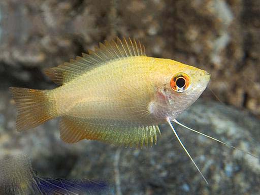 Тело самцов от желтовато-коричневого до оранжево-красного цвета. В период нереста окраска становится очень яркой, тело приобретает ярко-красный цвет. От глаза до основания по боку проходит темно-коричневая полоса, брюхо более светлое, серебристое. На спинном плавнике по верхнему краю идет лимонно-желтая полоса. Нитевидные брюшные плавники — ярко-оранжевые или красные. Окраска самок схожа с окраской самцов, но не такая яркая.