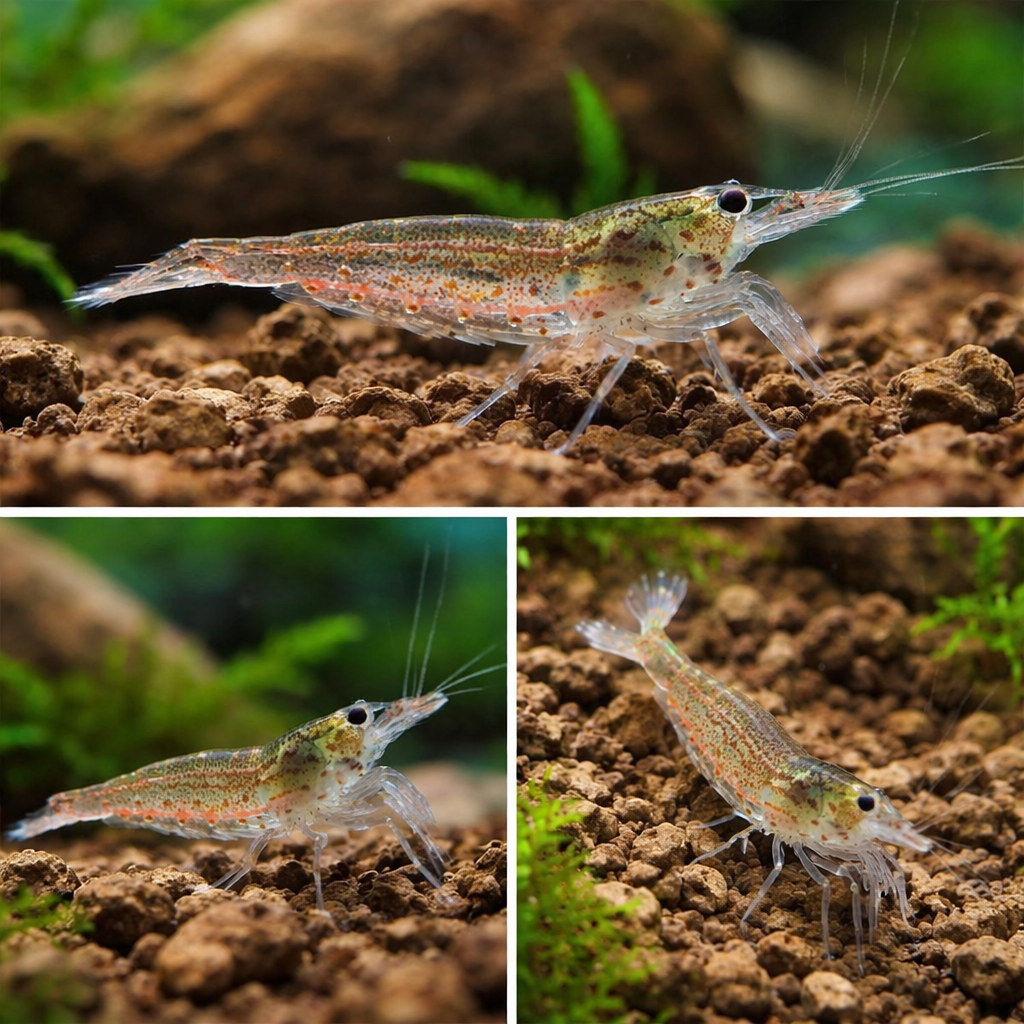 Размер креветок в среднем 3-5 см. (самки крупнее самцов, вырастают до 6 см). Поведение креветок неагрессивное, наоборот Аманки – безобиднейшие существа.
