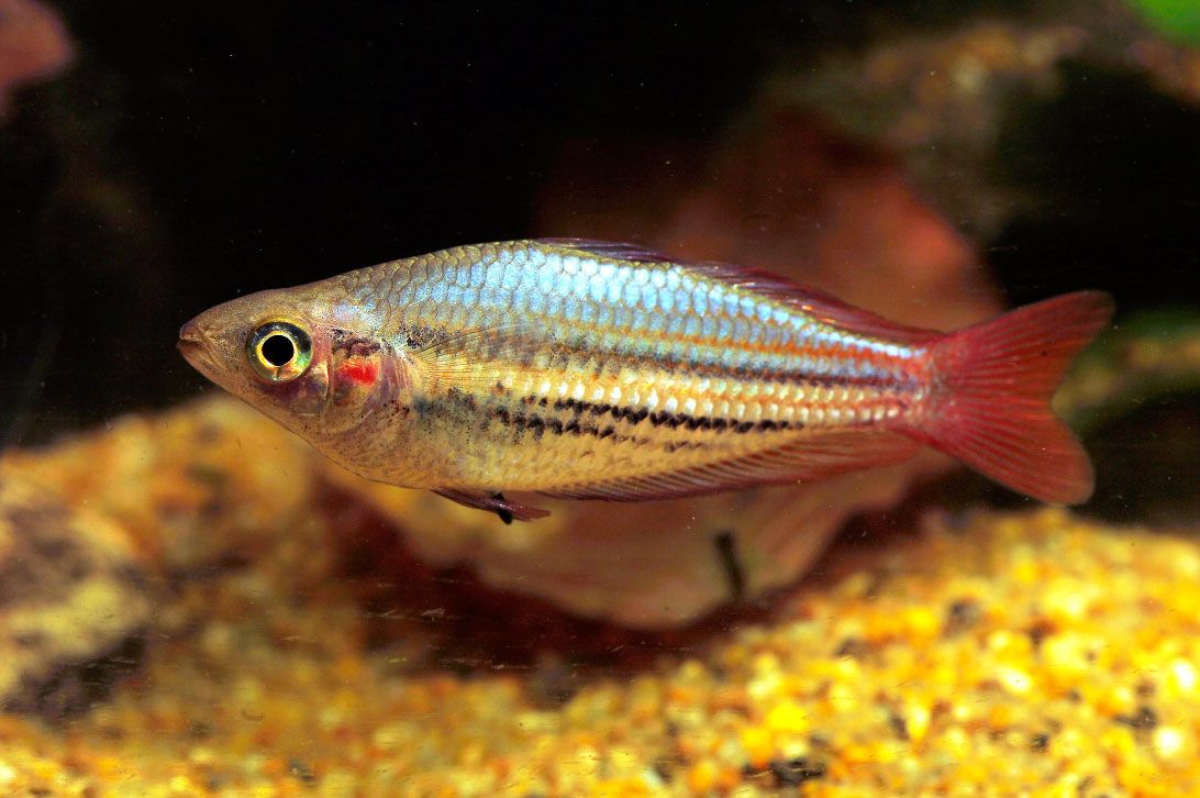 Взрослые особи достигают в длину около 12 см. Окраска пёстрая, тело украшают несколько горизонтальных полосок разных цветов (чёрные, голубые, оранжевые), спинка голубоватая. Плавники и хвост имеют больше красных оттенков. Расцвета может отличаться в зависимости от региона происхождения. Половой диморфизм выражен слабо, самцы несколько крупнее и ярче самок.