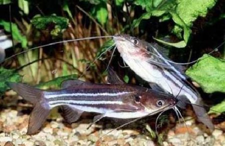Касатка полосатая -длина до 20 —22 см, в аквариумах в 1,5 —2 раза мельче.Тело вытянутое, голова большая. На верхней челюсти у них располагаются очень длинные усы. Окраска рыб варьирует в зависимости от р-на происхождения. Фон боков тела может быть от серебристо-серого до ярко-золотого, 5 —6 продольных линий, сужающихся к хвосту, — от голубого или светло-фиолетового до темно-коричневого или черного цвета; за жаберной крышкой — большое темное плечевое пятно; плавники бесцветные, прозрачные. Самки крупнее и полнее.Самцы стройнее, мельче, ярче.