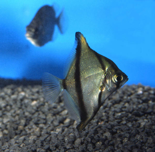 Монодактила еще часто называют рыбой-ласточкой. Его тело очень высокое и уплощенное, плавники своеобразной формы, из-за чего монодактил похож на ромб (или сбоку на ласточку). Глаза большие, рот маленького размера, хвост треугольной формы с ровными краями, чешуя всего тела очень мелкая. В аквариумах наиболее распространены: монодактил серебряный и монодактил темный. Первый имеет более яркую серебристую окраску и желтые плавники, по голове и телу проходит полоса темного цвета. Окрас второго намного сдержанней, он стального оттенка, через тело и голову проходят две-три поперечные полосы. Самцы монодактилов крупнее самок. Растут эти рыбки в аквариумах до 10 см, живут 5-7 лет.