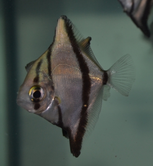 Монодактила еще часто называют рыбой-ласточкой. Его тело очень высокое и уплощенное, плавники своеобразной формы, из-за чего монодактил похож на ромб (или сбоку на ласточку). Глаза большие, рот маленького размера, хвост треугольной формы с ровными краями, чешуя всего тела очень мелкая. В аквариумах наиболее распространены: монодактил серебряный и монодактил темный. Первый имеет более яркую серебристую окраску и желтые плавники, по голове и телу проходит полоса темного цвета. Окрас второго намного сдержанней, он стального оттенка, через тело и голову проходят две-три поперечные полосы. Самцы монодактилов крупнее самок. Растут эти рыбки в аквариумах до 10 см, живут 5-7 лет.