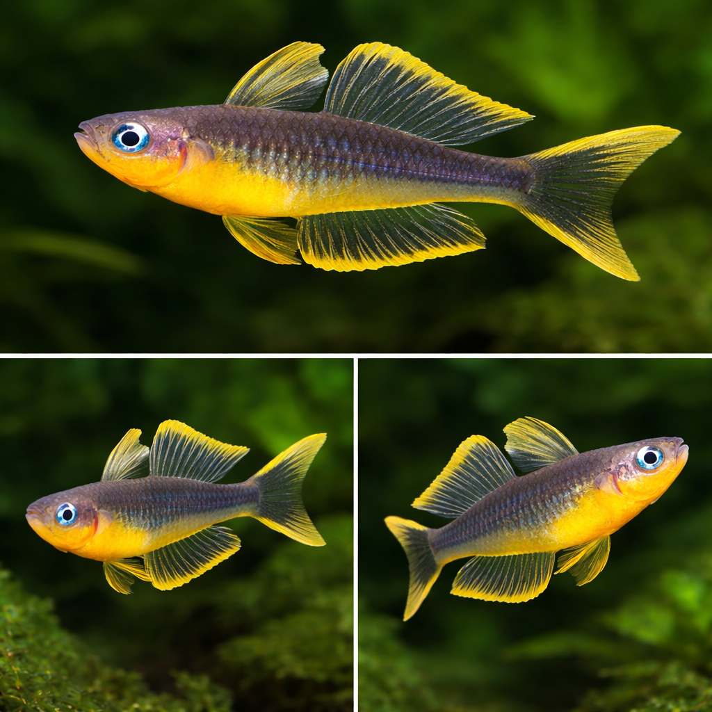 Размер рыбки совсем небольшой. В аквариуме она не вырастет более пяти сантиметров в длину. Окрашена рыбка пестро. Основной цвет сине-зеленый с желтым пятном на брюшке и ярко-желтыми плавниками. Самцы окрашены ярче самок и имеют более длинные плавники. У некоторых представителей вида плавники имеют красноватый оттенок плавников.