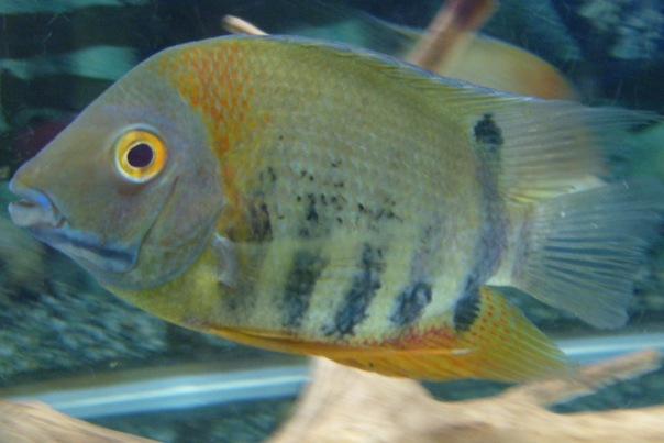 Цихлазома северум – крупная высокотелая цихлида. Ее еще называют ложным дискусом, хотя форма ее массивного тела нисколько не напоминает изящный плоский диск. Северум в переводе с латыни — «сдержанный», что относится, скорее всего, к внешности рыбы. Плотный серо-коричневый корпус с оливковым отливом, более высокий, чем у обычных цихлазом, с боков мелкий крап бурого цвета. Спинной плавник окрашен от оливково-зеленого до почти черного цвета, анальный плавник – с красноватой верхней частью, а хвостовой – серо-зеленый. Аквариумные северумы окрашены с разной интенсивностью.