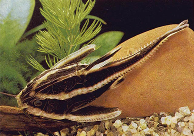Описание: У платидораса на спине располагаются две широкие продольные чёрные полосы. На лучах спинных и грудных плавников имеются острые шипы. Также маленькие загнутые шипы есть по бокам. Передняя часть тела покрыта прочным костным панцирем.