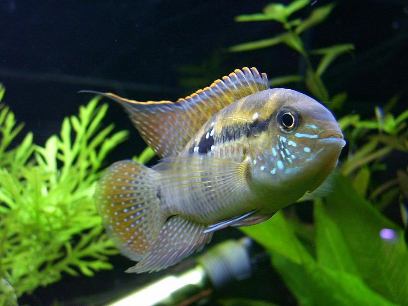 Окраска у акары яркая, по темному телу идут голубовато-зеленые точки, а на плавниках красно-оранжевая окантовка.