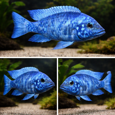 Самцы с возрастом становятся все более и более сине-голубыми. Тело взрослых самцов ярко синее, но покрыто нерегулярным узором из светло-голубых и белых пятен матового серебра разнообразной формы. Самцы из Танзании имеют вертикальные полосы по всему телу, а на западном побережье не имеют вертикальных полос.