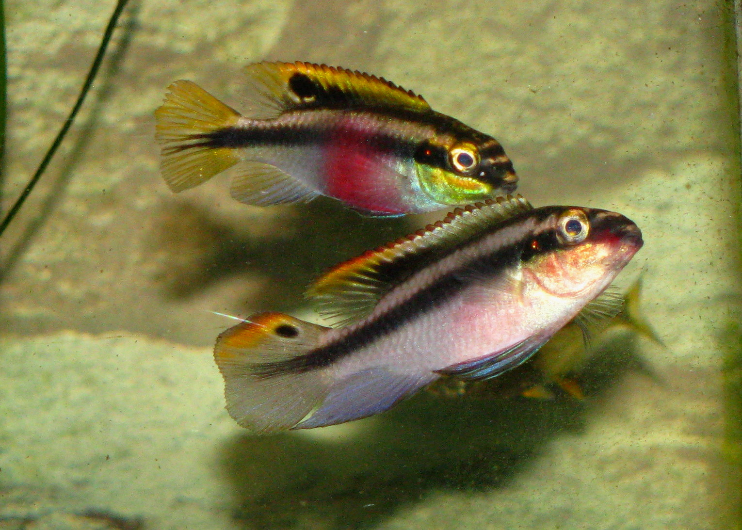 Плавники от золотисто-желтого до коричневого цвета. Непарные плавники с черновато-красной каймой и светло-голубой полосой под ней. В нижней части спинного плавника проходит черная полоса. В основании хвостового плавника темное пятно. Самцы стройнее, мельче самок. В месячном возрасте мальки приобретают окраску взрослых рыб, но общий фон у них более темный, начинают “желтеть” в 2-3 месяца.