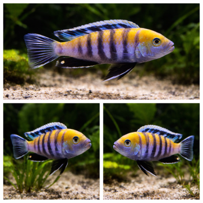 Тело вытянуто и приплюснуто с боков. На теле имеются от 6 до 9 поперечных чёрных полос, основная окраска тела голубая, спина с возрастом становится желтой. Их вертикальные полосы тускнеют или становятся ярче зависимости от настроения. У самцов два или более характерных жёлтых пятен на анальном плавнике. Этот вид цихлид прост в содержании. Их можно спокойно содержать с более крупными, но мирными видами малавийских цихлид. Они очень неприхотливы в плане диеты и просты в размножении. В период нереста или во время стычек с другими особями их окраска становится очень интенсивной. Стоит избегать перекрестного скрещивания с похожими цихлидами чтобы сохранять чистую окраску вида.