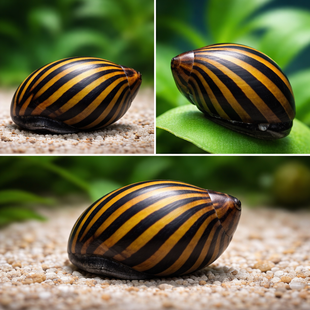 Окрас раковины варьируется от зеленовато-желтого до желтовато-коричневого с кривыми широкими черными полосами. Эти полосы начинаются от начала завитка и постепенно расширяются к низу. Узоры на раковины очень разнообразны и двух улиток с одинаковым узором Вы не найдете. Благодаря такому красивому контрастному окрасу улитка зебра так нравится аквариумистам, ведь золотисто-черная раковина моллюска очень красиво смотрится на зеленом фоне аквариумных растений.