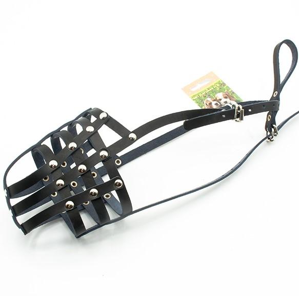 Изготовлен из полос высококачественной натуральной кожи черного цвета шириной 10 мм. Полосы крепко соединены металлическими никелированными заклепками. Снабжен двумя металлическими роликовыми пряжками. Окружность морды 28-30 см. Длина 10см. Застежка регулируется по размеру морды собаки. Предназначен для хаски, мелких овчарок и проч.