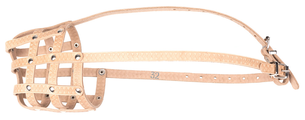 Универсальный кожаный намордник-корзинка с дополнительным налобным ремешком.