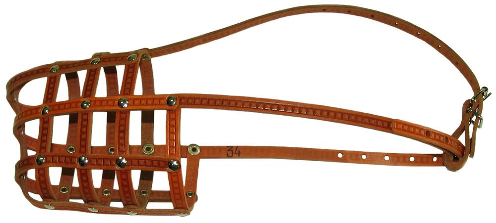 Универсальный кожаный намордник-корзинка с дополнительным налобным ремешком.