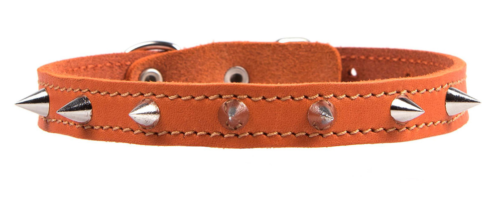 Однослойный ошейник из натуральной кожи, украшенный шипами, прошит декоративной строчкой, полукольцо у пряжки.