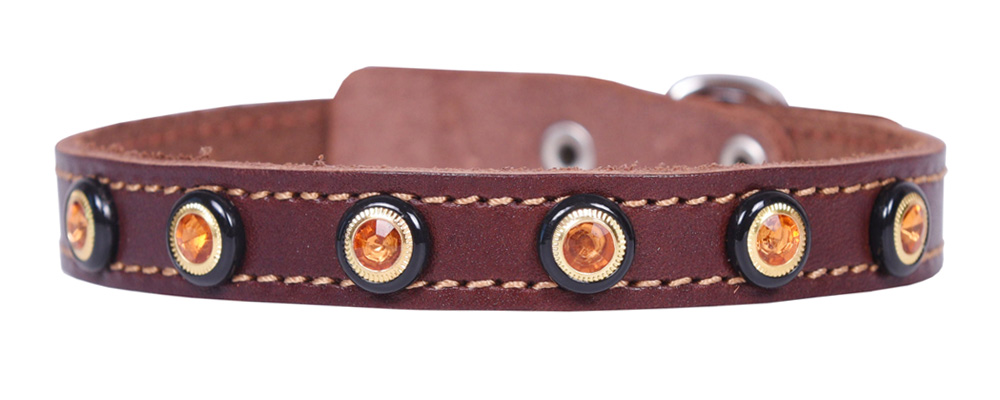 Однослойный ошейник из натуральной кожи, украшенный стразами, прошит декоративной строчкой, полукольцо у пряжки.